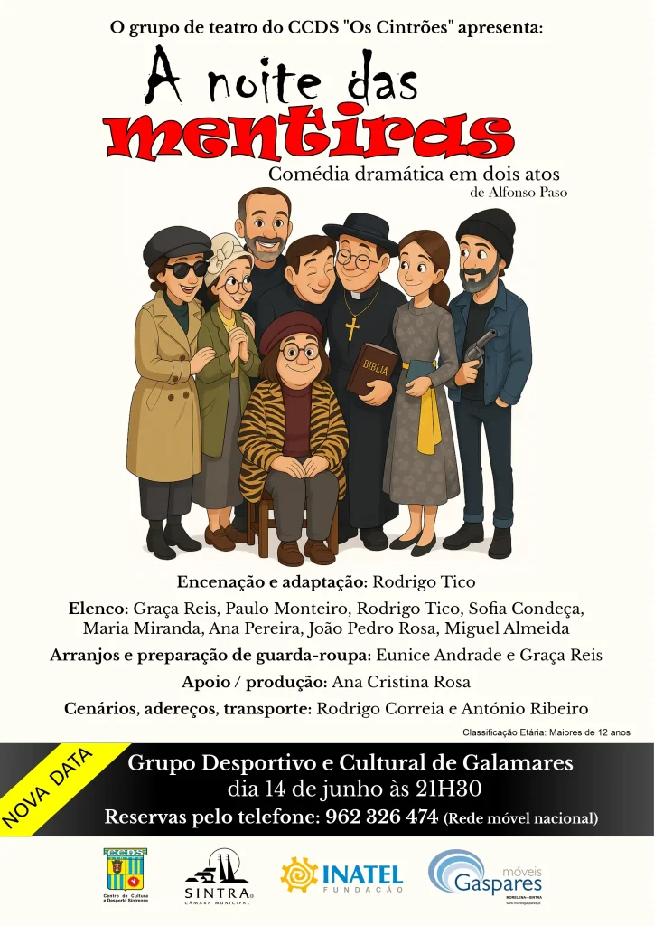 O grupo de teatro “Os Cintrões”, do Centro Cultural e Desportivo de Sintra, prepara-se para subir novamente ao palco com a segunda apresentação da comédia dramática “A Noite das Mentiras”, desta feita nas instalações do Grupo Desportivo e Cultural de Galamares.
