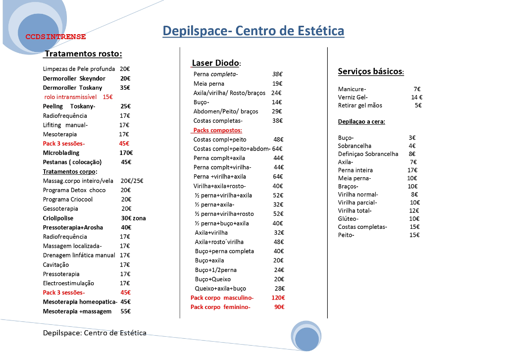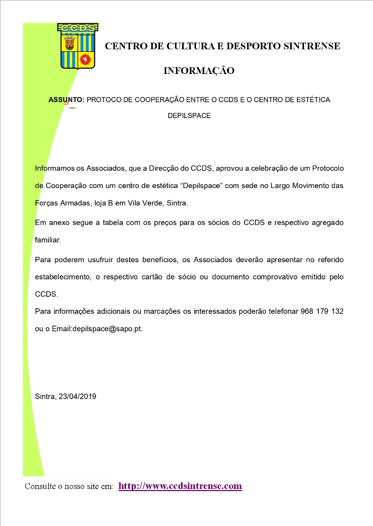 Informamos os Associados, que a Direcção do CCDS, aprovou a celebração de um Protocolo de Cooperação com um centro de estética “Depilspace” com sede no Largo Movimento das Forças Armadas, loja B em Vila Verde, Sintra.